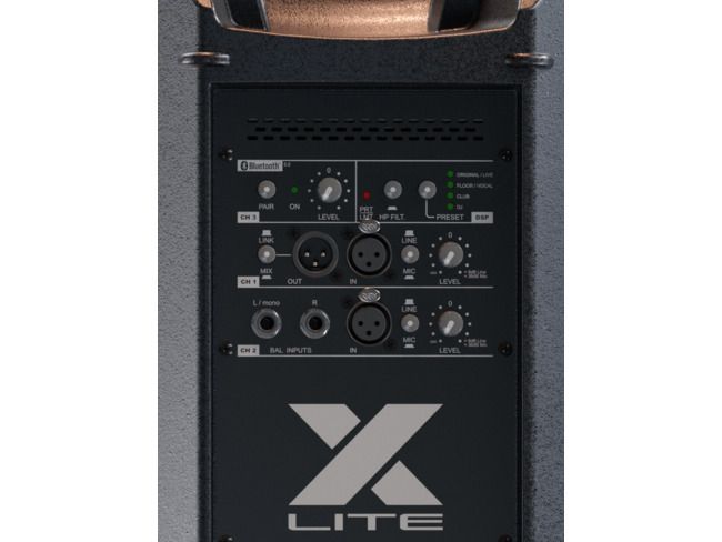 The bi-amplified FBT XLITE 110A active speaker feature a 1200W low frequency amp and a 300W high frequency amp. The control panel features a three-channel mixer with two micro-line inputs, a stereo input and a dedicated channel for bluetooth 5.0; two XLR inputs, stereo input, XLR output with ch1 or mix link selector, HP filter, two mic-line selectors, DSP preset selector, Bluetooth 5.0 with pairing led. 4 x M10 rigging points built-in into the cabinet along with the optional mounting brackets allow the FBT XLITE 110A speaker to be surface mounted on walls or ceilings.